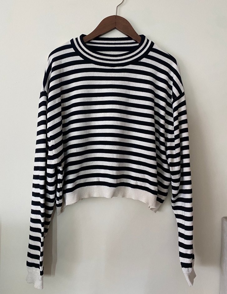 Uzun kollu, siyah beyaz çizgili, yuvarlak yakalı ve bol kesim triko kazak. Günlük rahat kullanım için uygundur. Standart bedendir.