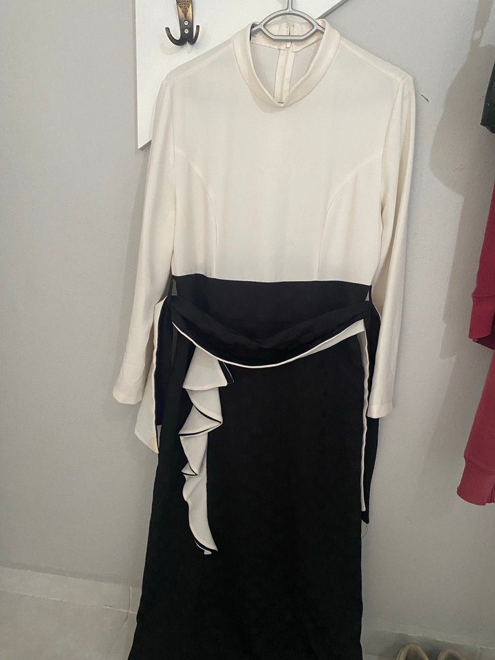 Yüksek yakalı ve uzun kollu bu uzun elbise, beyaz ve siyah sentetik kumaşlarla drapeli detaylar sunar. Regular fit olup, avant-garde ve Goth tarzında, günlük kullanıma uygundur. Abiye seminerin hiç kullanılmadı