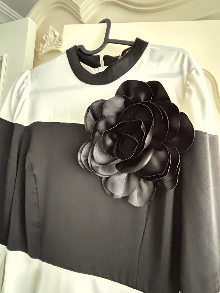 Yüksek yakalı, uzun kollu, siyah beyaz renklerde, göğüste büyük siyah çiçek detaylı, vücuda oturan uzun elbise, düğün için uygun.