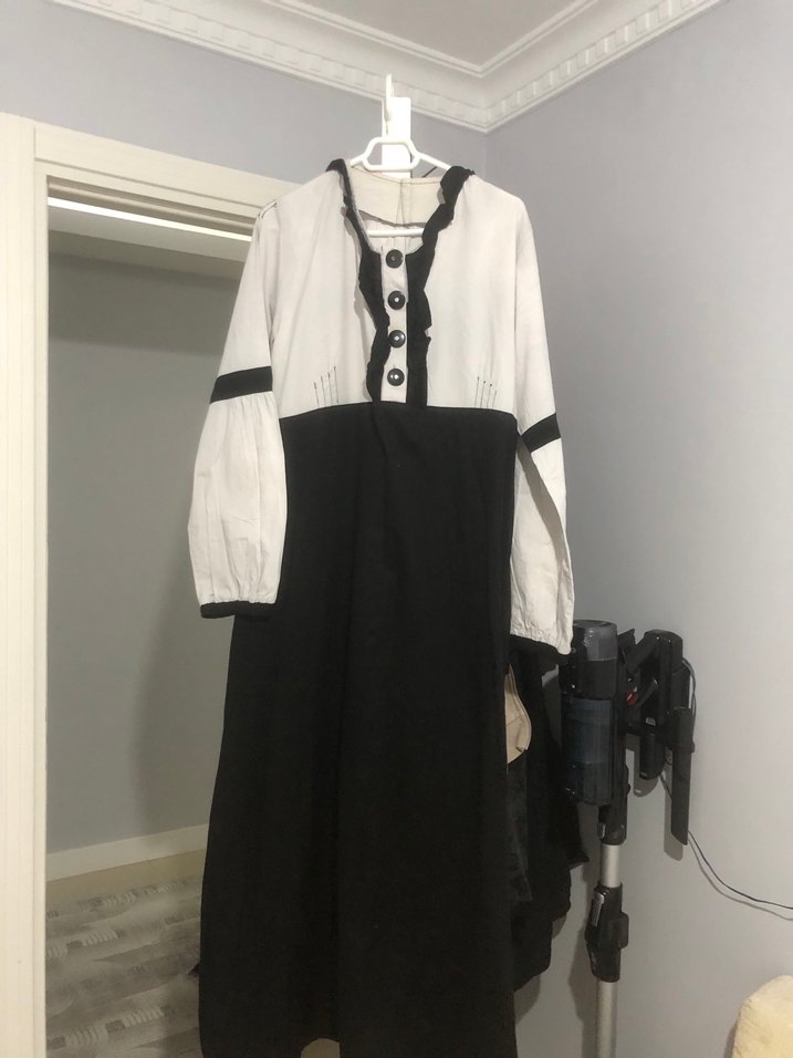 Pamuklu uzun kollu, düğmeli, bol kesim siyah beyaz elbise. Günlük kullanım için uygundur. özel dikimdir