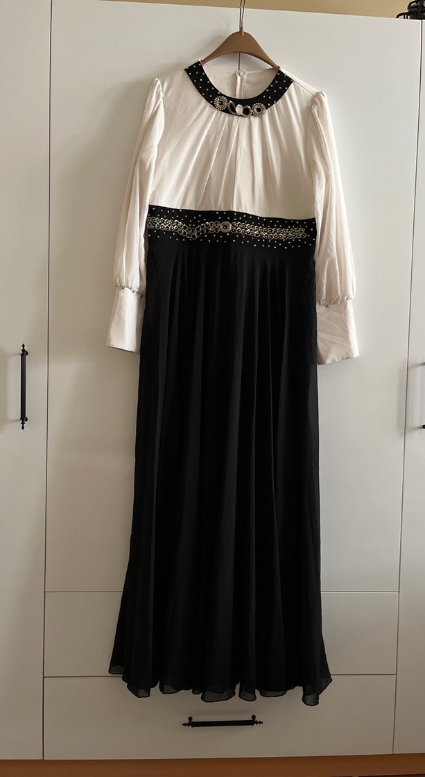Uzun Kollu Siyah Beyaz Pilili Uzun Elbise