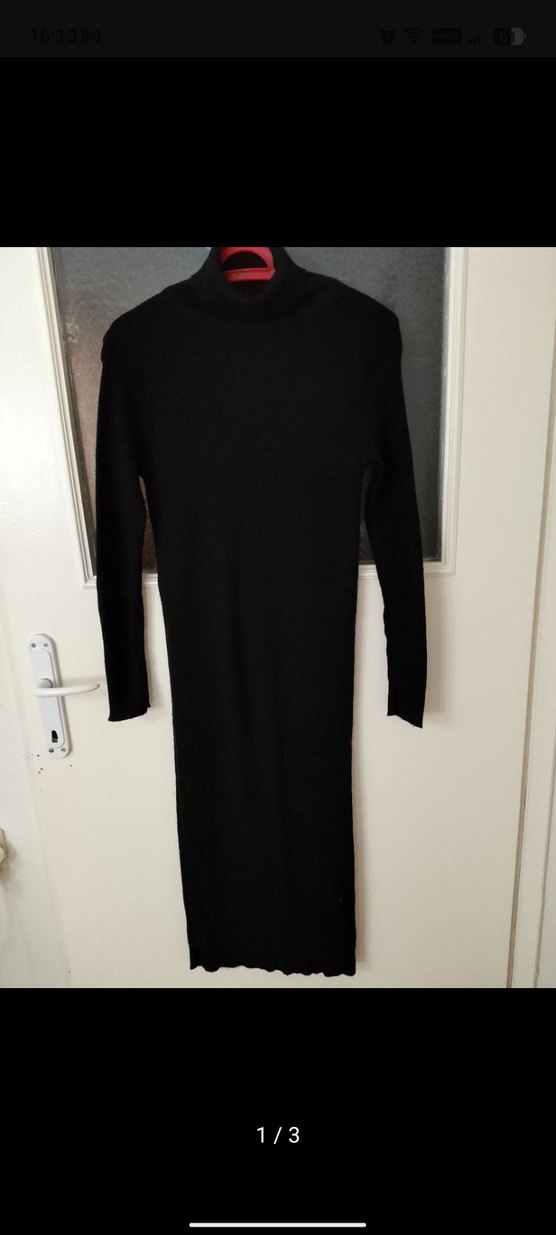 Siyah uzun kollu, boğazlı ve vücuda oturan bu uzun elbise, yumuşak sentetik kumaştan yapılmıştır ve yırtmaç detayı vardır. Minimalist gotik tarzıyla günlük kullanım için uygundur.