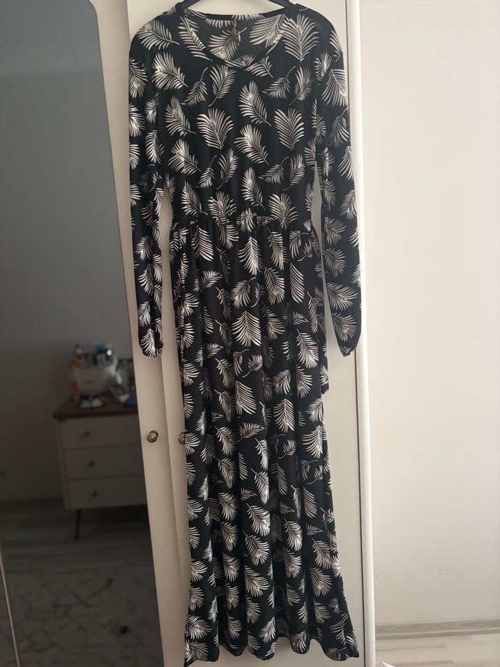 Uzun kollu, V yakalı, yaprak desenli siyah bohem elbise. Rahat kesimli ve pileli detaylara sahip, yumuşak sentetik kumaştan yapılmıştır. Günlük kullanıma uygundur. L/XL beden