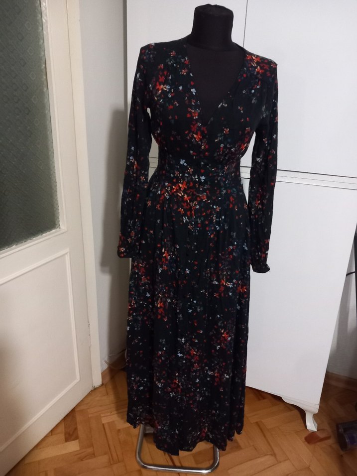 Siyah bohem uzun elbise, uzun kollu ve V yakalıdır. Rahat kesimli, drapeli sentetik kumaşı koyu tie-dye deseniyle romantik akşamlar için uygundur.