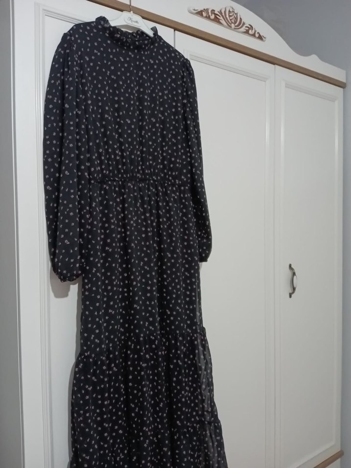 Siyah renkte, sentetik kumaştan üretilmiş, bol kesim uzun elbise. V yaka ve fırfır detayları ile bohem tarzını yansıtır.