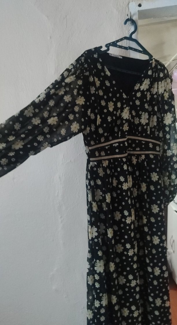 Siyah, uzun kollu, düğmeli ve V yakalı bol kesim uzun elbise. Çiçek desenli kumaşı bohem tarzında, günlük kullanıma uygundur. beli çok hoş yırtığı fln yoktur