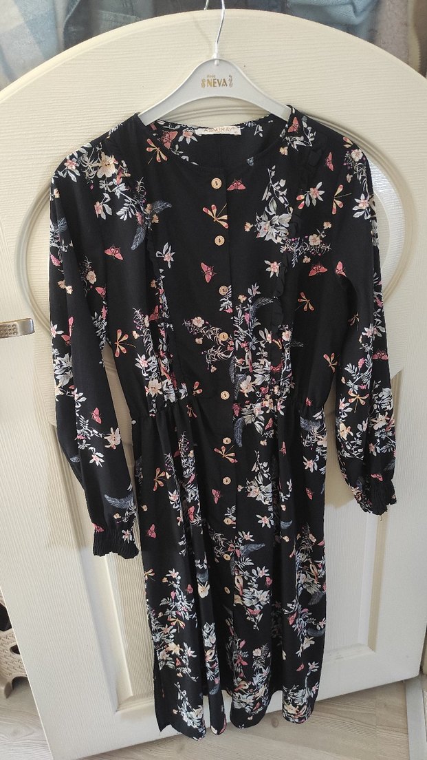 Siyah renkli, uzun kollu ve düğmeli elbise. yuvarlak yaka, bol kesim ve bohem desenlere sahip, yumuşak sentetik kumaştan üretilmiştir.
