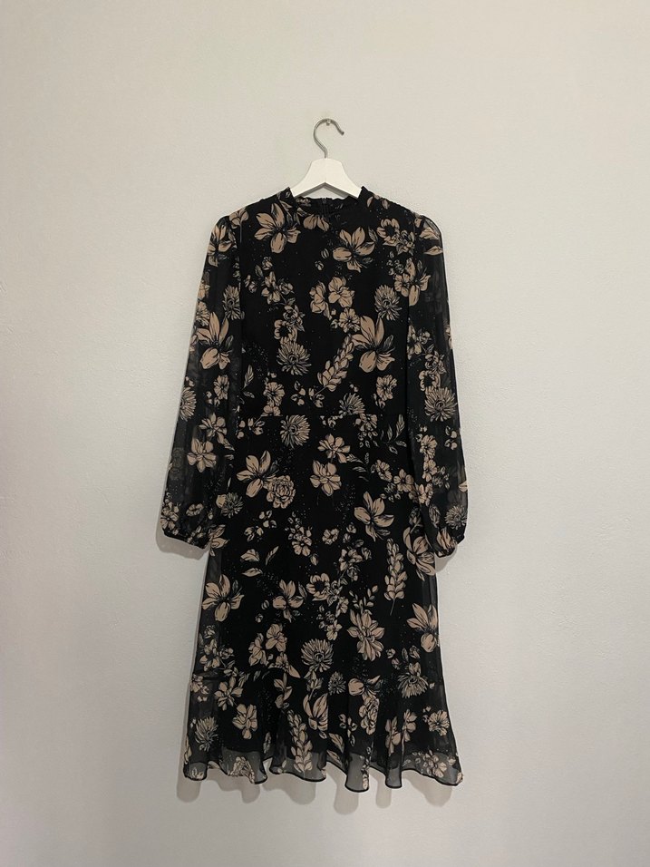 Siyah uzun kollu, yüksek yakalı, çiçek desenli bohem tarzda, bol kesim ve drapeli elbise.