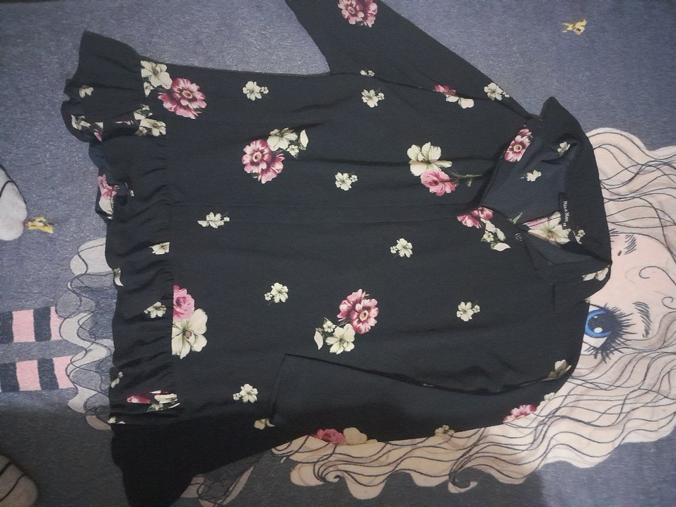 Bu siyah hamile tunik, v yaka ve uzun kollu, bol kesimdir. Çiçekli baskılı vintage bohem tarzı ve fırfır detaylarıyla günlük kullanıma uygundur.