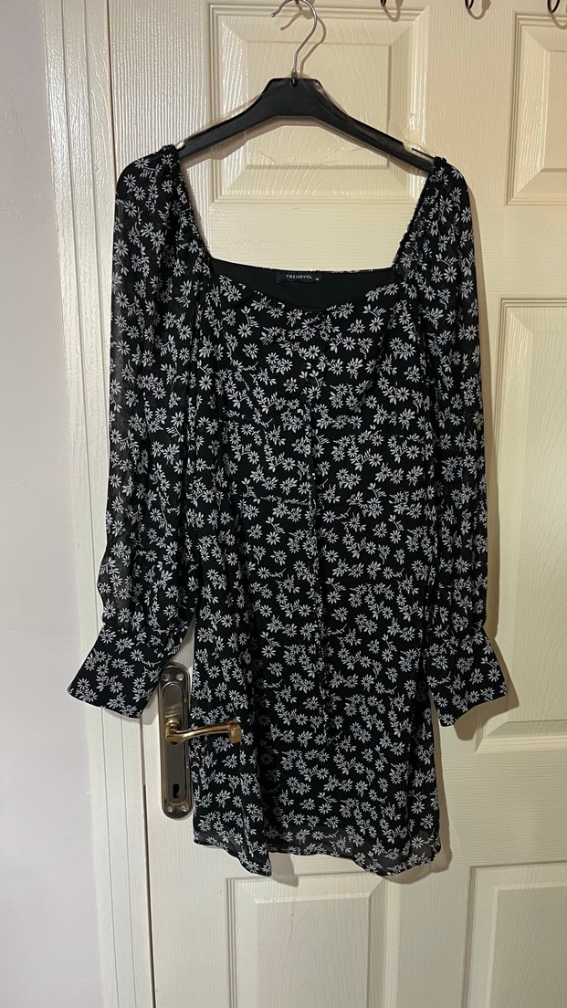 Uzun kollu, düğmeli, siyah çiçek desenli midi elbise. Geniş kesim ve tekne yaka ile rahat kullanım sunar.