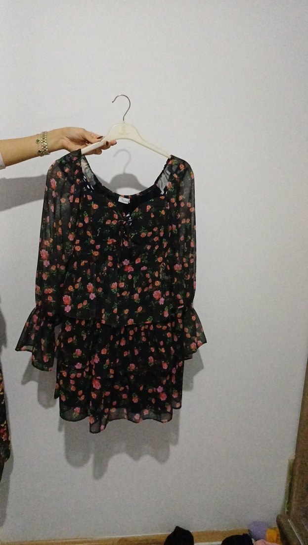 Uzun kollu, straplez yaka ve fırfırlı detaylara sahip siyah mini elbise. Gevşek kesimi ve koyu çiçek desenleriyle günlük kullanıma uygundur.