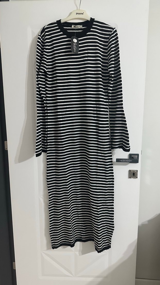 Uzun kollu, siyah beyaz çizgili, kruvaze yaka ve pile detaylı, rahat sentetik kumaştan günlük sokak stili elbise. Hiç kullanılmamış bedeni standart