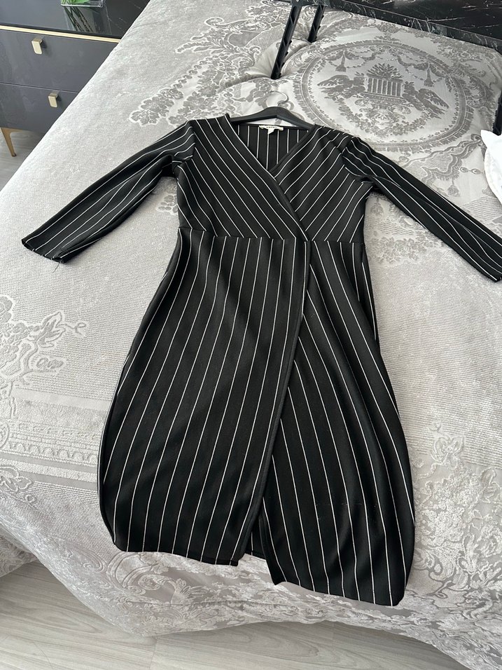 Siyah renkli, çizgili ve uzun kollu bu kalem elbise, V yakaya ve pile detaylara sahiptir. Ofis için uygun, trend goth tarzında şık bir modeldir.