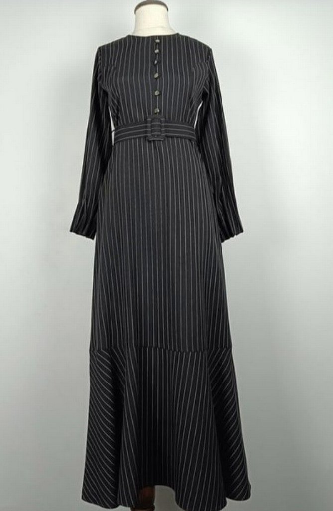 38 40 42 uyuml7 Uzun kollu, beyaz çizgili bu elbise, regular kesim ve kesik yaka detayıyla ofis için uygun, gotik stil esintili.