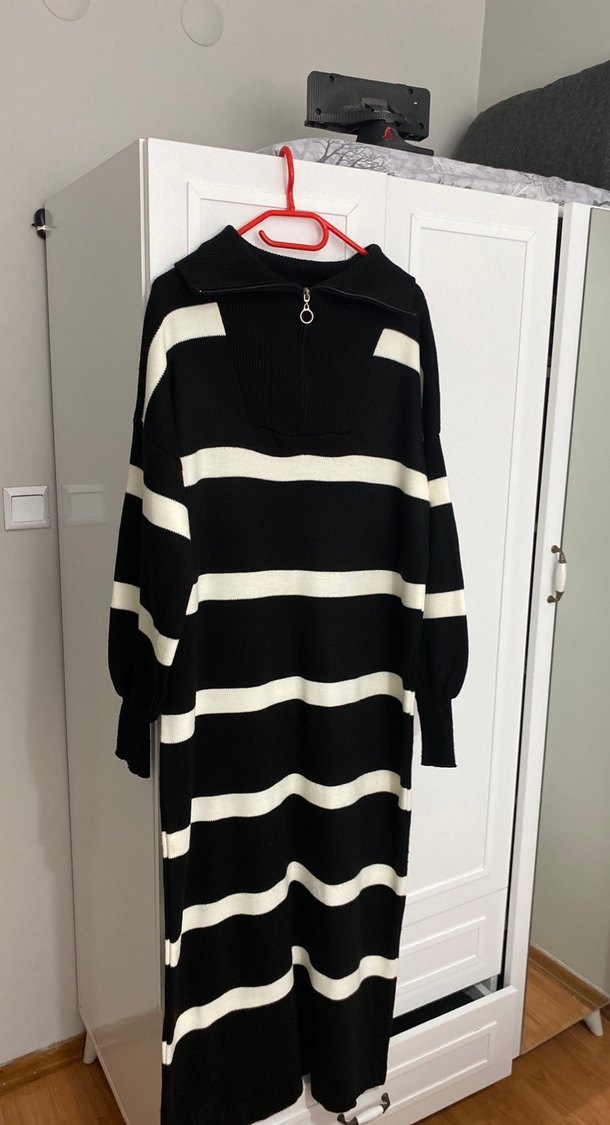 Yüksek yakalı, bol kesim siyah beyaz çizgili uzun triko elbise. Uzun kollu ve rahat, günlük kullanıma uygun bir model. Standart Beden uzunluk 157cm en 58cm