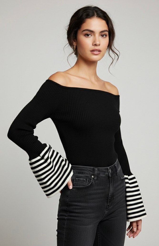 Uzun Kollu Siyah Çizgili Triko Kadın Kazak