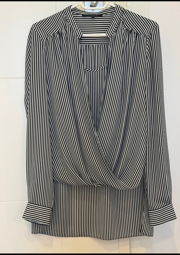 Uzun kollu, V yakalı ve pile detaylı kadın gömleği. Siyah beyaz çizgili, bol kesim ve uzun boylu, sentetik kumaştan. Ofis için çağdaş Paris tarzı.