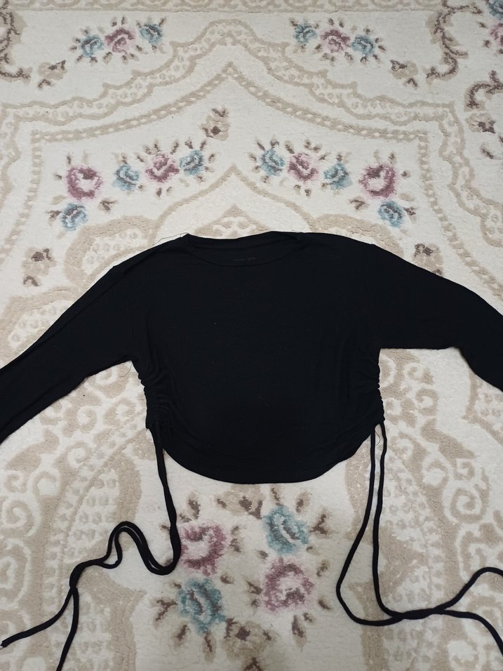 Siyah, uzun kollu, crop top. Yanlarında bağcıkları bulunan, günlük kullanıma uygun goth tarzda bir ürün ince kumaş