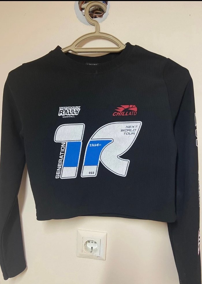 Uzun kollu, siyah ve vücuda oturan crop top. Üzerinde baskılı grafikler ve örme dokusu bulunur. Trendy dış mekan kullanımı için uygun. "CHILLATE" yazılı.