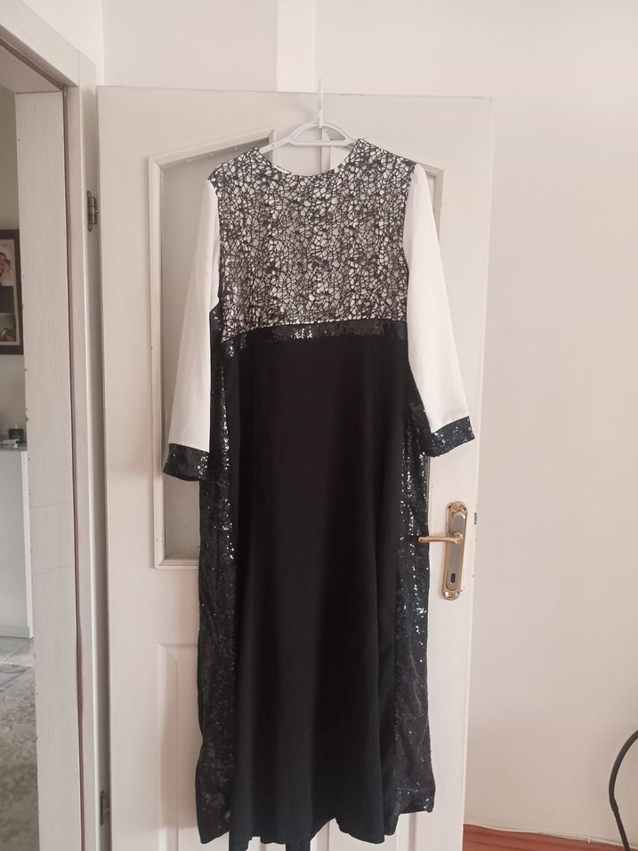Siyah uzun elbise, uzun kollu ve yüksek yakalıdır. Dantel ve baskılı sentetik kumaş kullanılarak tasarlanmış, bol kesimdir. Gotik ve avangart stillere uygundur, düğünler için idealdir.