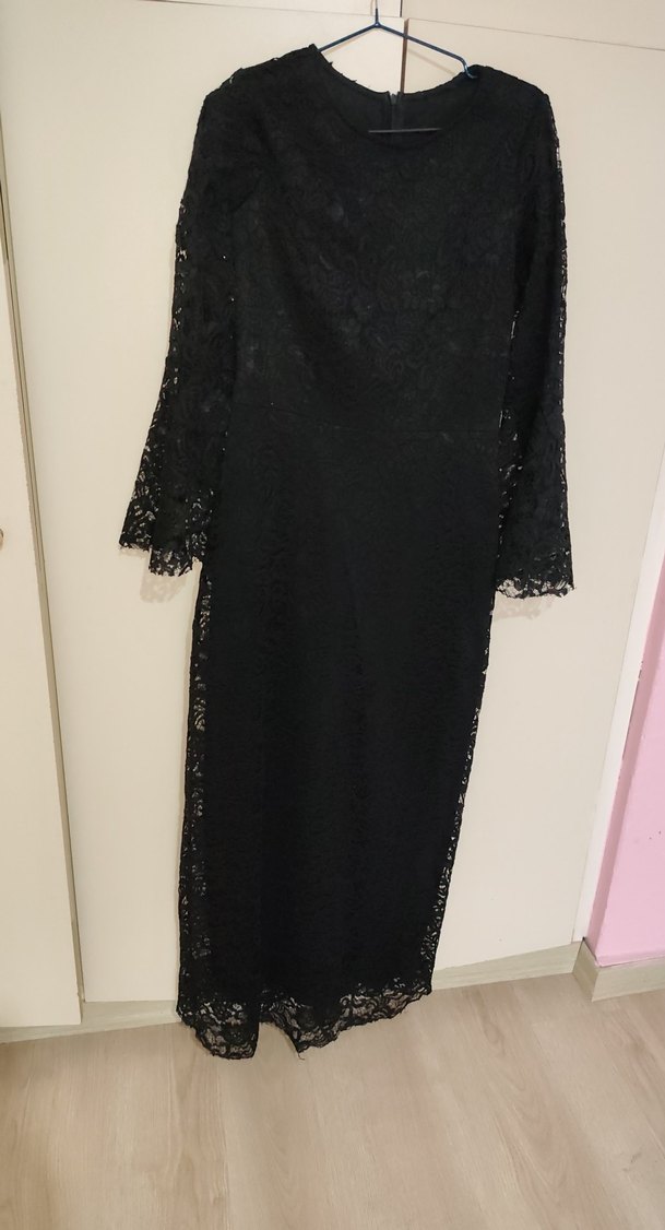 Uzun kollu dantel detaylı, tek renk siyah, sade ve şık gotik abiye elbise, klasik zarafeti yansıtır.