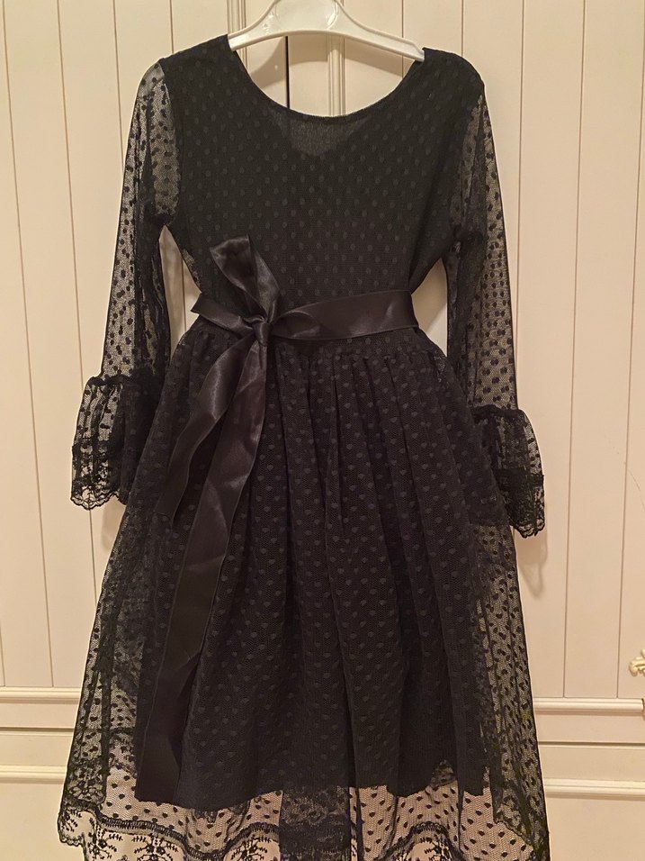 Siyah renkli kız elbisesi, uzun kollu ve V yakalıdır. İpek gibi kumaş ve dantel detaylara sahiptir. Salaş kesim ve saten kemer ile tamamlanmıştır.