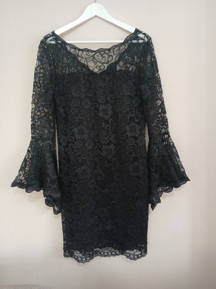 Uzun kollu, V yakalı siyah dantel midi elbise, fit kesimi ve gotik tarzıyla romantik akşamlar için uygun. Beden ölçüsü iki kol arası göğüs 50 cm uzunluk 93 cm kol genişliği omuzdan 42 cm koldan genişlik 30 cm kol uzunluğu 60 cm