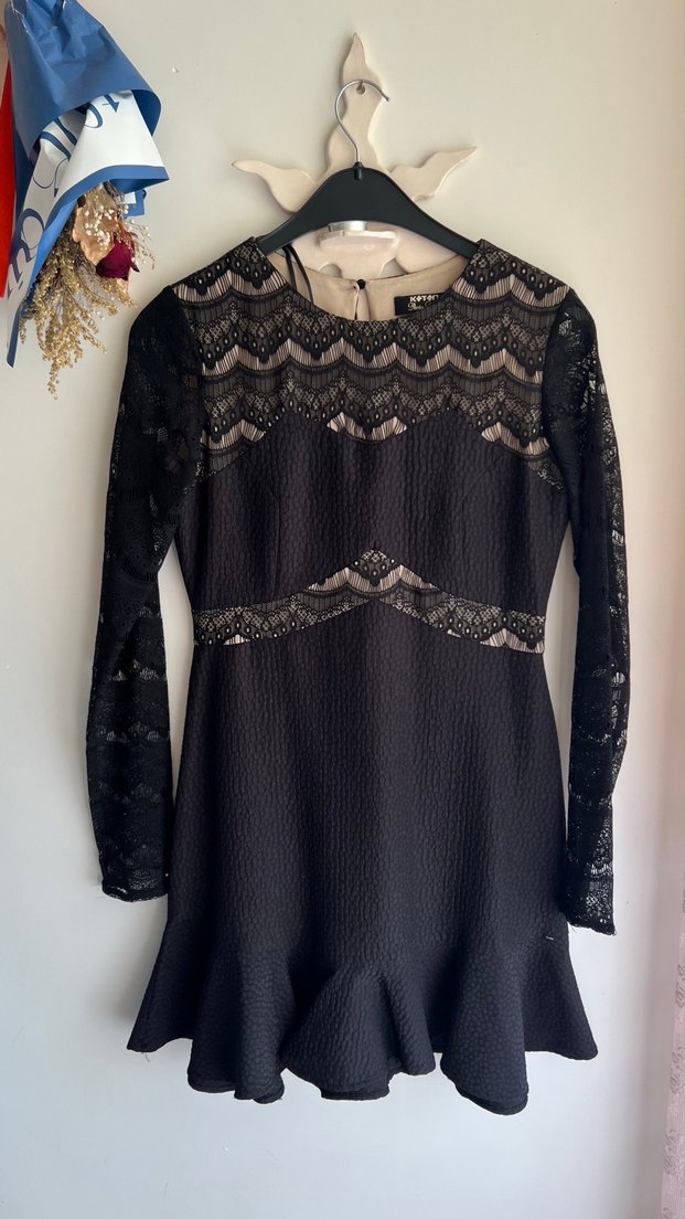 Siyah dantel detaylı, uzun kollu ve yüksek yakalı midi boy dar kesim elbise, romantik akşamlar için uygundur. Duruşu çok güzeldir 38 beden 161 boy 54 kiloyum