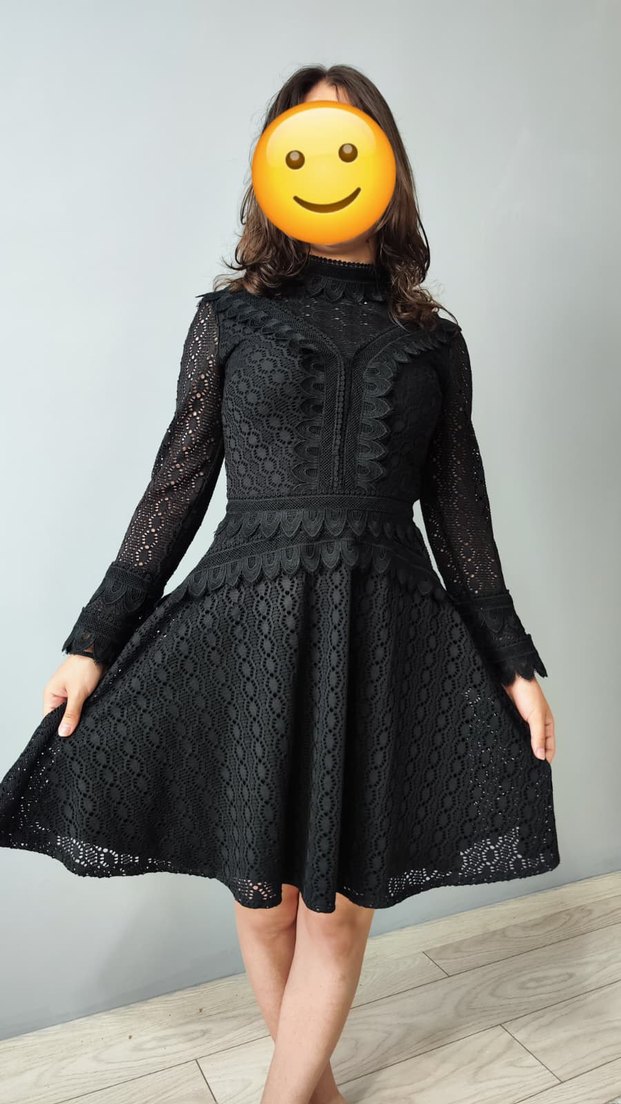 Siyah, dantelli uzun kollu ve yüksek yakalı, klasik şıklıkta, ofis için uygun midi elbise.90 cm uzunluğu 36 bel kısmının genişliğinde