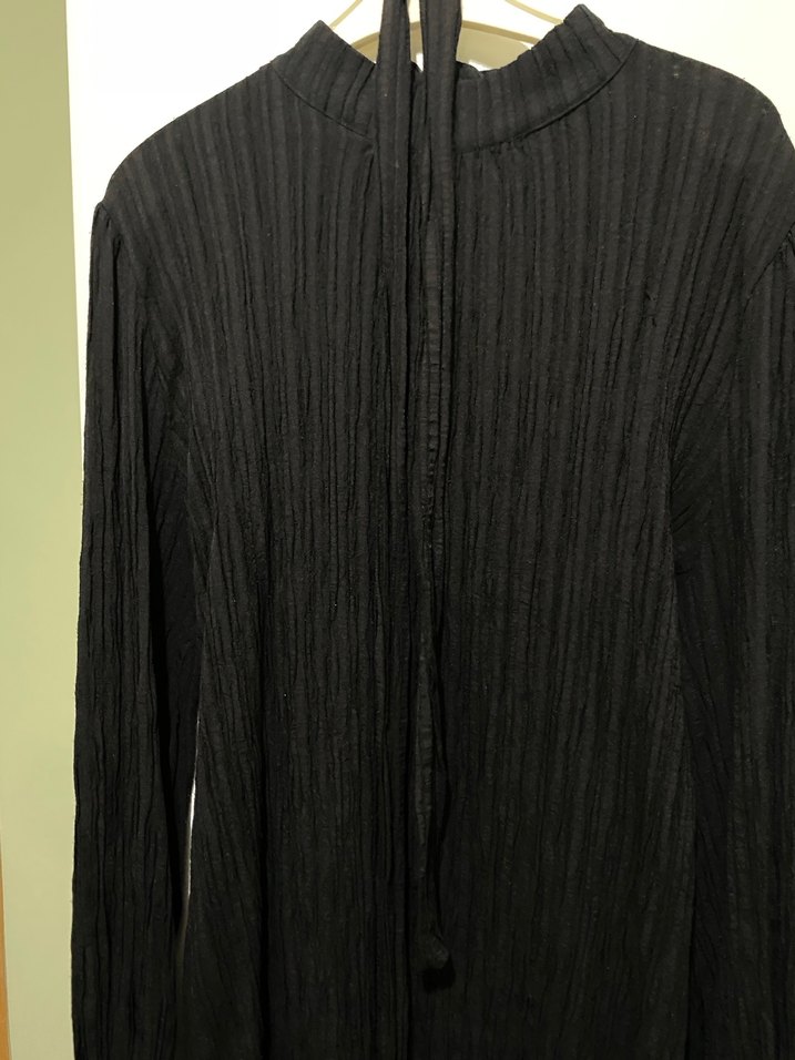 Bu bol kesim dar kalıp bluz, uzun kollu ve yüksek yakalıdır, plise keten kumaştan yapılmıştır. Siyah rengi ve avant-garde gotik stili ofis kullanımı için uygundur.