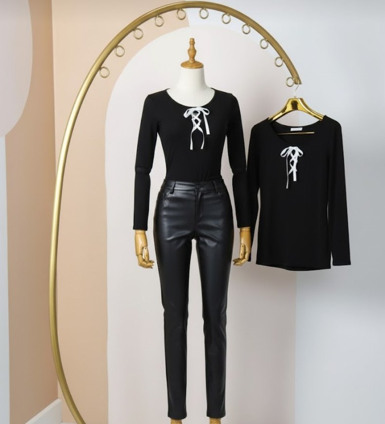 Siyah uzun kollu, beyaz bağcıklı detaylı, deri kumaştan ofis için şık bluz.