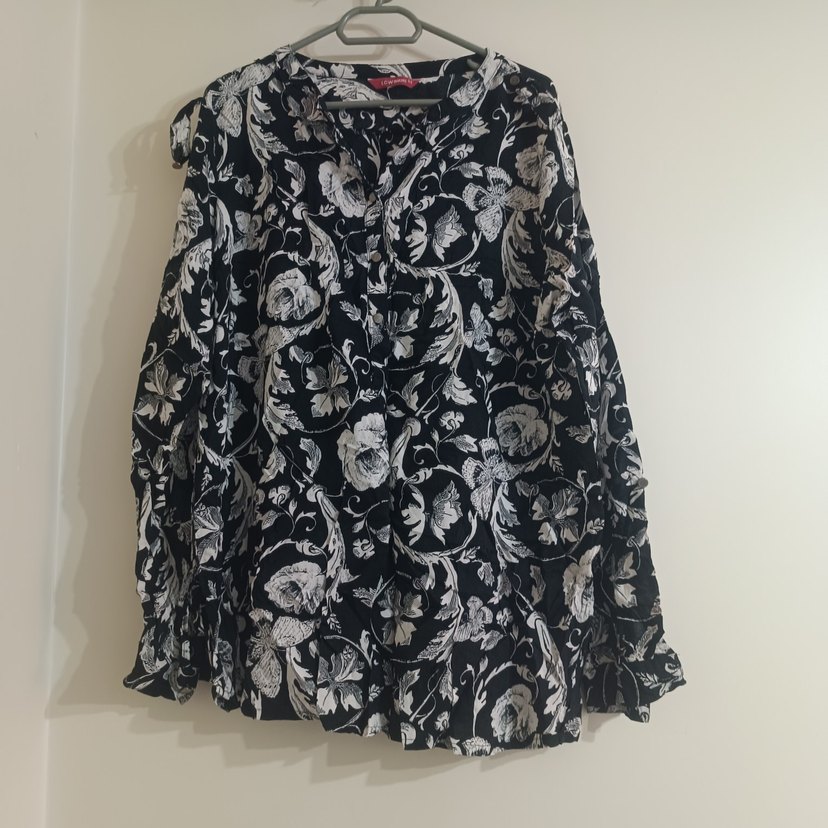 Uzun kollu, volan detaylı siyah desenli bol kesim bluz. Yüksek yakalı ve koyu çiçek desenli, günlük kullanıma uygun gotik ve bohem tarz.
