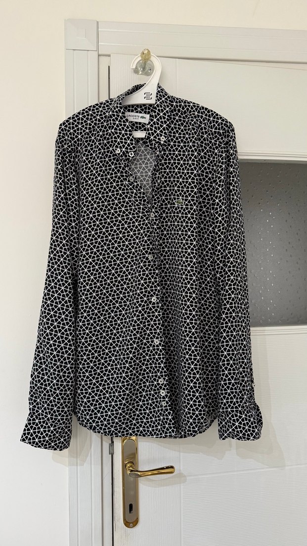 Uzun kollu, düğmeli ve yakalı erkek gömleği. Siyah sentetik kumaş üzerine beyaz geometrik desenli, günlük rahat kullanıma uygun.