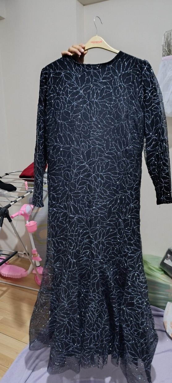 Uzun kollu, bol kesim ve drapeli siyah desenli kadın abiye elbise. Avant-garde ve gotik tarzları yansıtan bu model düğün için uygundur.