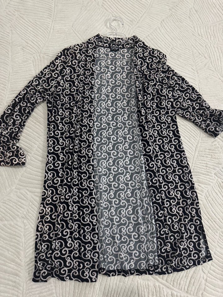 Uzun kollu, bol kesim kadın sabahlık, siyah zemin üzerinde beyaz desenlerle bohem Paris tarzını yansıtıyor. Hiç giyilmedi dış giyim olarak kullanılıyor üzeri taşlıdır çok şık bir model