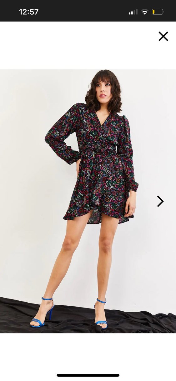 Uzun kollu, V yakalı ve belden kemerli siyah kısa elbise. Renkli batik desenlerle hareketlendirilmiş, romantik akşamlar için uygun.