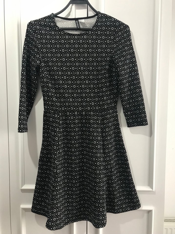 Yetim kollu, bisiklet yakalı, siyah ve gri desenli, pilili mini elbise. Yumuşak sentetik kumaştan, günlük kullanıma uygun minimalist gotik tarzda. Hm marka. 1 kez giyildi defosu yok.