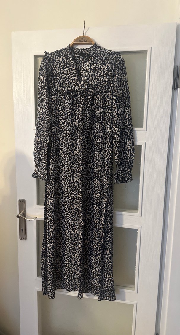 Uzun Kollu Siyah Desenli Uzun Elbise