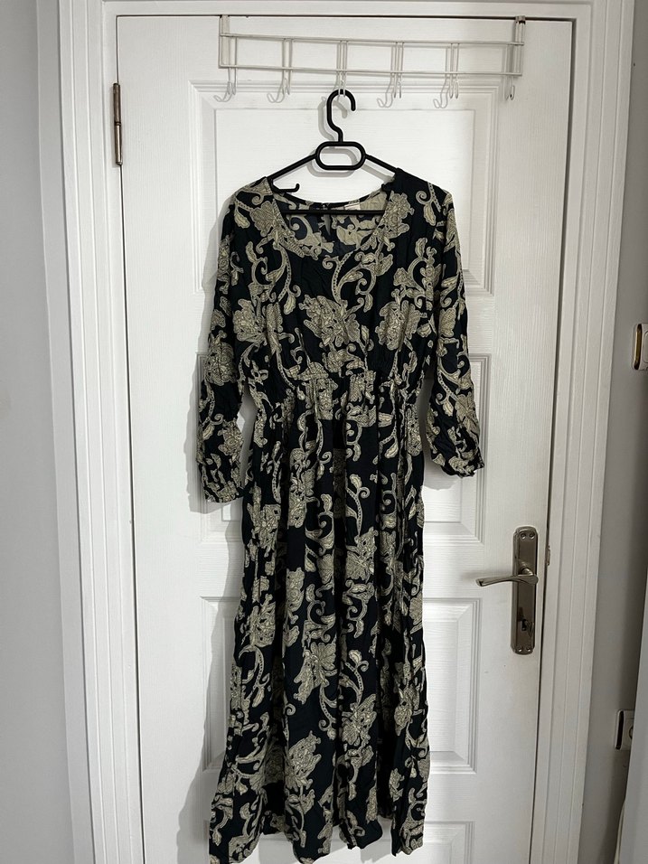 Uzun kollu, V yakalı ve bol kesim siyah desenli elbise.Vintage tarzda bir elbise ütülenerek gönderilecektir.