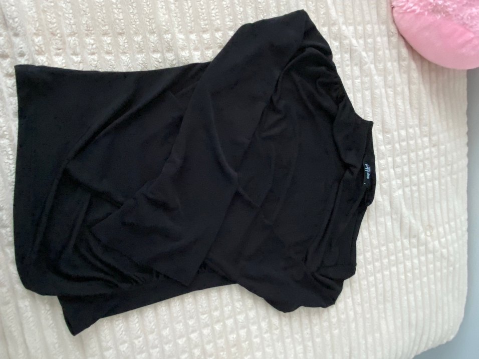 Yüksek yakalı, uzun kollu ve dökümlü tasarımlı siyah ha bluz. Yumuşak sentetik kumaştan, günlük kullanım için uygun.