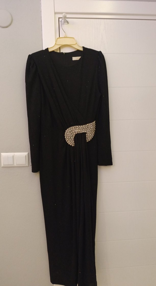 Uzun kollu, bisiklet yakalı siyah abiye elbise, bedenize oturan kesimi ve belde şık drapeli detay ile düğünler için uygun.