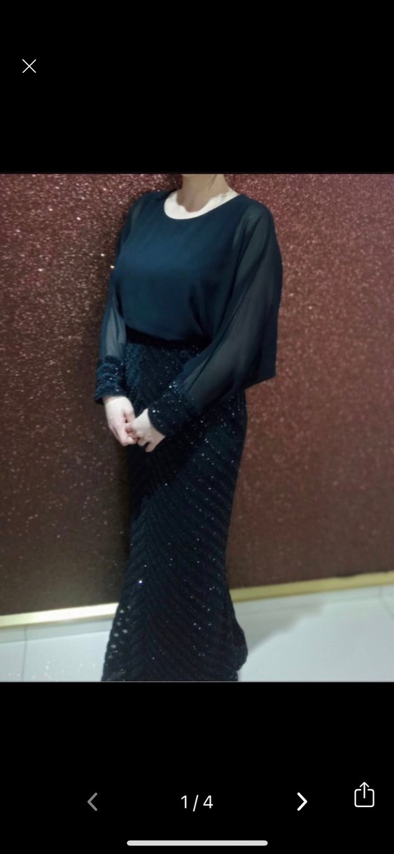 Uzun kollu, yuvarlak yaka ve drapeli, desenli etekli siyah abiye elbise, romantik akşamlar için uygun.