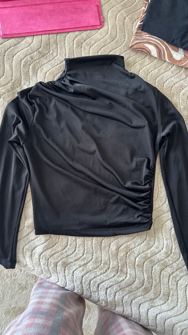 Drapeli ve boğazlı uzun kollu, siyah renkli, vücuda oturan bluz. Pürüzsüz sentetik kumaştan, günlük kullanım için uygundur.