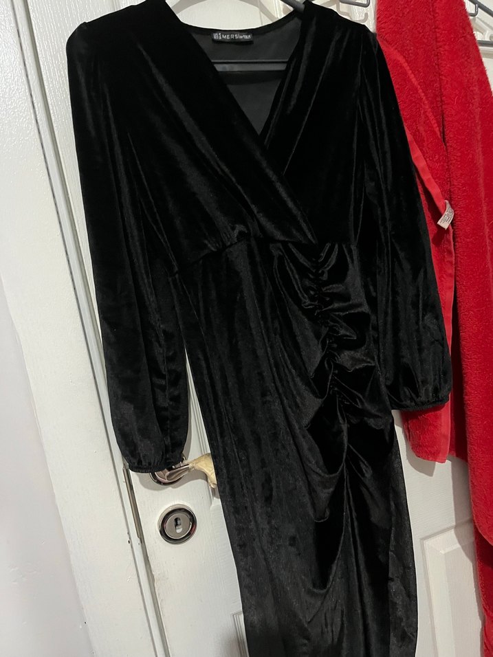 Siyah, uzun kollu, V yaka ve drapeli detaylara sahip, klasik zarafeti yansıtan gotik tarzda dar kesim abiye elbise. Ofis etkinlikleri için uygun.