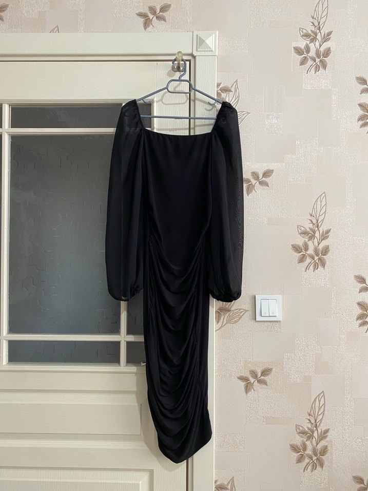 Uzun kollu ve kayık yaka, drapeli detaylara sahip siyah, vücuda oturan gotik tarzda uzun elbise. Avant-garde moda sevenler için ideal.
