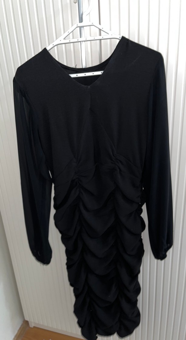 Bu uzun kollu, siyah ve vücuda oturan elbise, V yakası ve şık drapeleriyle romantik randevular için uygundur.