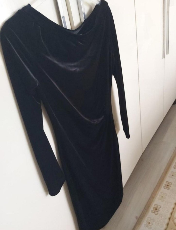 Uzun kollu, drapeli V yakalı siyah elbise,kadife ve şık, desensiz tasarımıyla dikkat çekiyor.