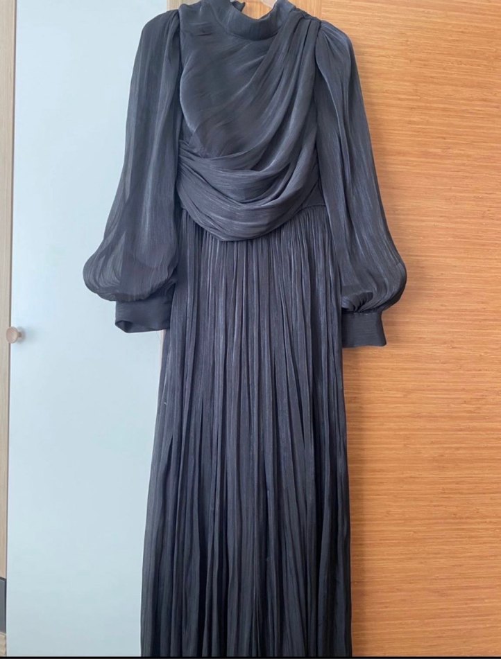 Yüksek yakalı, uzun kollu ve bol kesimli siyah abiye elbise, drapeli tasarımı ve pileli eteğiyle modern klasik bir görünüm sunar. Siyaha yakın koyu bir fümedir