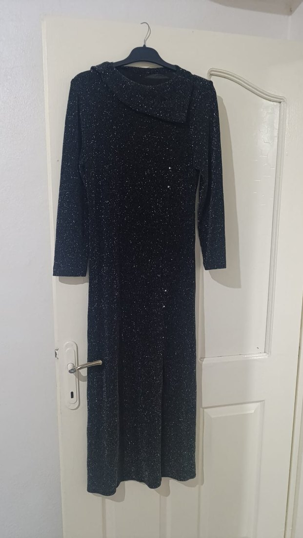 Uzun Kollu Siyah Drapeli Kadın Abiye Elbise