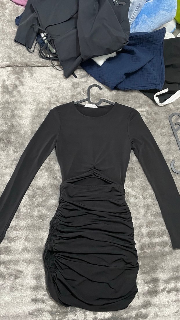 Uzun kollu, yuvarlak yakalı ve drapeli tasarıma sahip siyah dar kesim kadın elbisesi, romantik akşamlar için ideal, minimalist gotik tarzda.